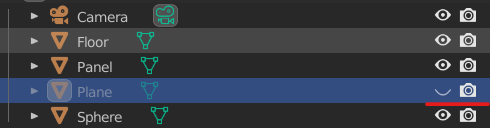 + 눈 아이콘(Hide in view port) 뷰포트에서 안보이게 하는 것을 의미하고 카메라 아이콘(Disable in renders)의 경우 렌더링 화면에서 보일지 여부를 결정한다.