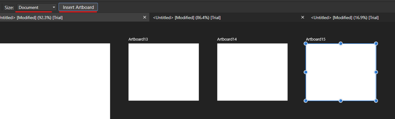 Size 에서 Document 선택 > Insert Artboard 선택 시 artboard가 일정간격으로 복사된다.