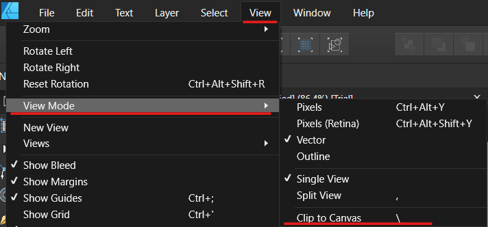 - View > View Mode > Clip to Canvas