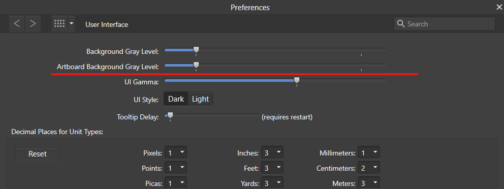 기본 Artboard Background Gray Level 이 밝게되있으므로 수치를 낮춰 어둡게 할 수 있다.